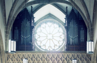 Neogotisches Orgelgehäuse aus Eiche, dunkel gebeizt.